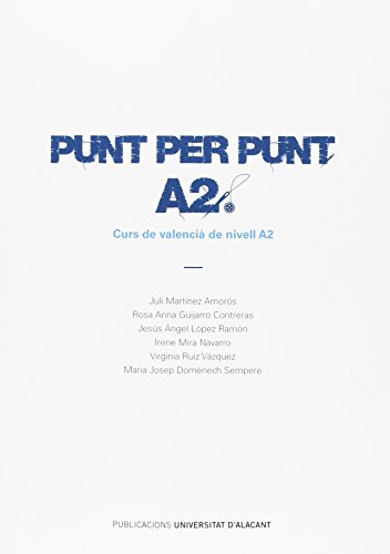 Destinatari. Punt per punt A2 és un curs de valencià destinat a aprenents sense cap coneixement previ del valencià, però que dominen amb prou solvència una altra llengua romànica, com ara el castellà, el gallec, el francés o l’italià, entre altres. Estructura del curs i punt de partida. És un curs per a autoaprenents o per a seguir a l’aula, compost per 18 unitats. Les 17 primeres desenvolupen el temari i l’última ofereix un model de prova, que permet posar en pràctica els coneixements adquirits. Conté exercicis autocorrectius, propostes d’activitats orals i un mètode pedagògic innovador: ensenya a fer, és a dir, a usar la llengua des d’un primer moment. El punt de partida de Punt per punt A2 són les conjugacions dels verbs més usuals, per exemple ser, estar, tindre, vindre, poder, etc. L’objectiu que ens plantegem és doble: ressaltar que conjugar correctament és la base per a adquirir un domini fluid en qualsevol llengua; i ajudar l’aprenent a fer frases i comunicar-se des del mateix moment que comença el curs. Estructura de les unitats i metodologia. A partir del significat dels verbs, proposem les explicacions de vocabulari i.